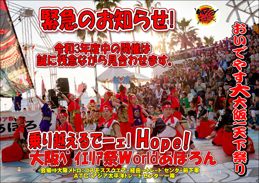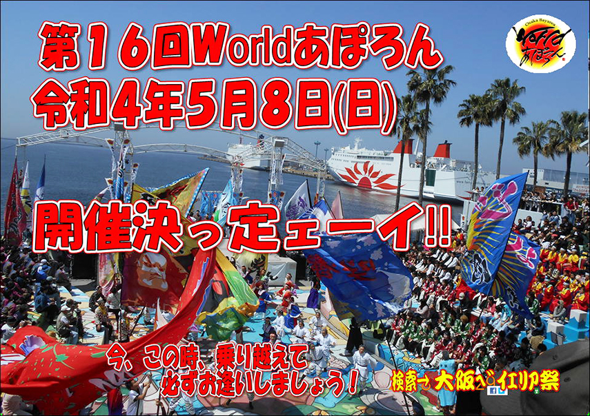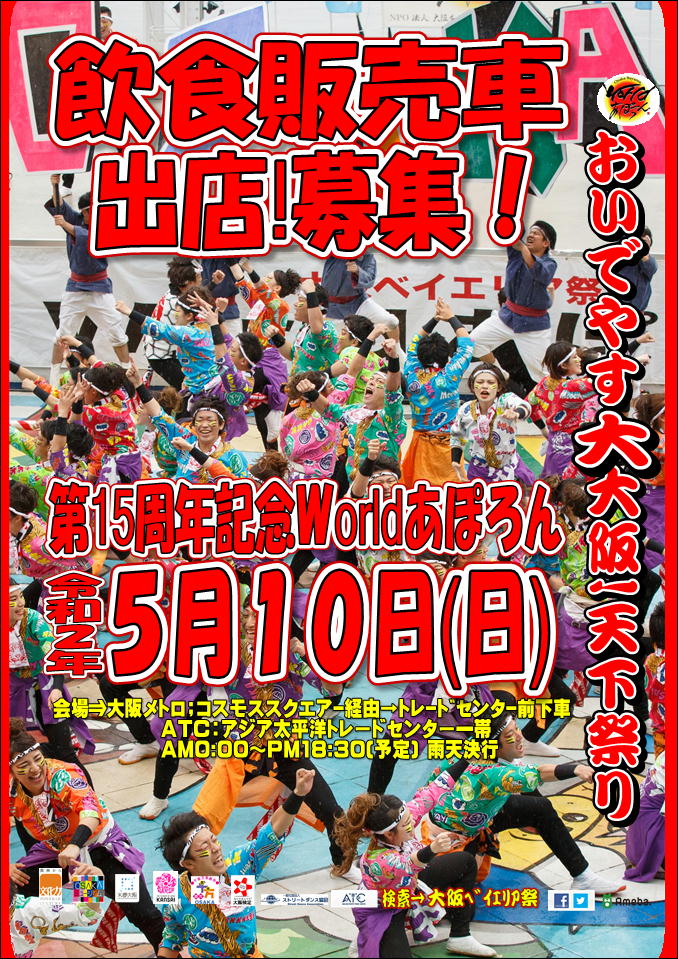 「緊急!!超重大発表!!」 11/21投稿 "Worldあぽろん存続をかけたクラウドファンディング開始" 第15周年記念大阪ベイエリア祭Worldあぽろん実行委員会 【お知らせ】新型コロナウイルス感染症拡大の影響により開催を中止いたします 9/4更新 【緊急!注意事項】踊り子チームの皆様へお願い←クリック 4/21更新 【速報!!】Worldあぽろん15周年を記念して初めての飲食販売車の募集をします。 ■名称 2020年 大阪ベイエリア祭 『第15回 Worldあぽろん』 ■開催日 2020年5月10日(日) ■開催場所 ●ATC(アジア太平洋トレードセンター) ■主催 大阪ベイエリア祭『Worldあぽろん』実行委員会 ■後援・協力 大阪府 大阪市 大阪市教育委員会 大阪商工会義所 (公財)関西・大阪21世紀協会 ■入場・観覧 無料 大変お待たせしました♪ 第2回『えぇ写真の募集!』 応募作品紹介♪