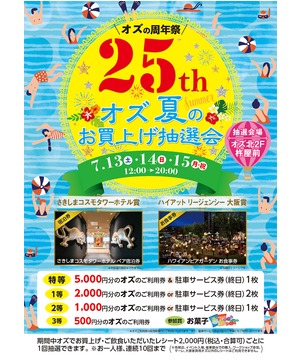 オズ25周年の感謝を込めて、さきしまコスモタワーホテル ペア宿泊券や、ハイアットリージェンシー大阪のハワイアンビアガーデンお食事券などの豪華賞品をご用意しています。