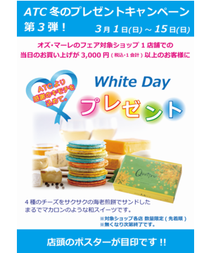 期間中、ATCのフェア対象ショップにて1店舗での当日のお買い上げが3,000円以上(税込・1会計)のお客様に、ホワイトデースイーツをプレゼント!
