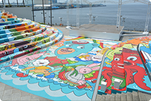 O's(オズ)北館と南館の間に位置する海に面した屋外ステージ。海を背景に眺められる開放感あるロケーションで、各種イベント、音楽ライブ、プロモーションなどのイベントが開催されます。すり鉢状になっている石段の客席は約2000名収容可能です。