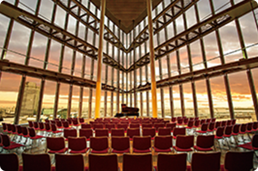ITM棟10階に、海を一望できるホール。200名収容の小ホールですが、象牙のグランドピアノを常設しており、クラシックを中心としたアコースティック演奏会を展開中です。
